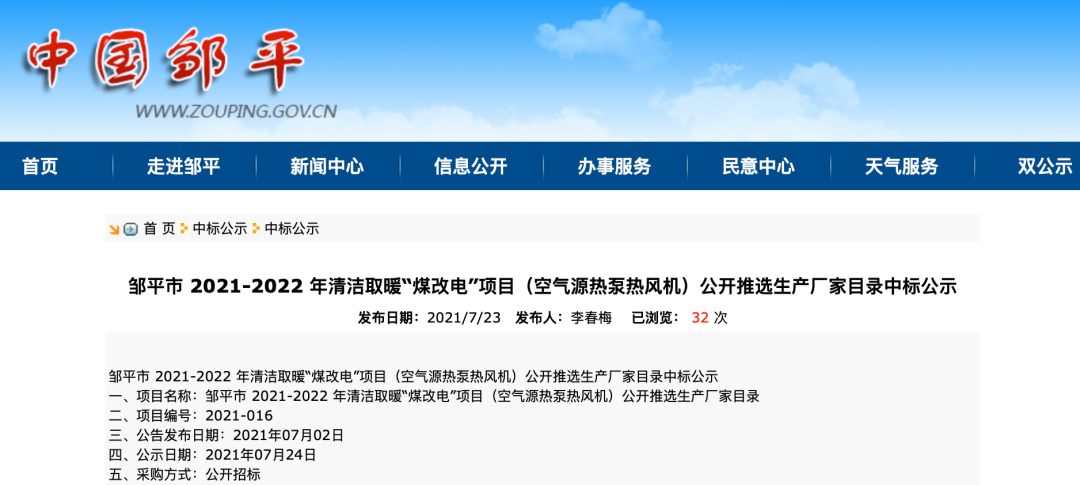 恭贺九州酷游空气能中标邹平市2021-2022年清洁取暖“煤改电”项目