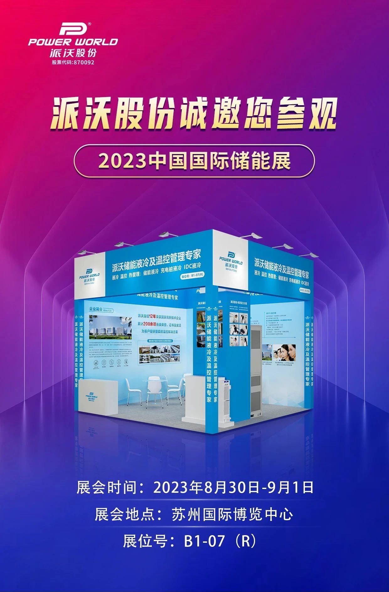 2023年8月30日至9月1日,由EESA储能领跑者联盟主办的第二届中国国际储能展览会将在苏州国际博览中心举办。九州酷游股份诚挚邀请您莅临B1馆07(R)展位现场交流,与您分享最新的液冷解决方案和技术,共探全球新能源储能发展趋势。