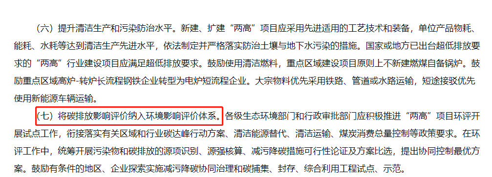 今年5月31日,我国生态环境部印发《关于加强高耗能、高排放建设项目生态环境源头防控的指导意见》,其中第7条明确指出:将碳排放影响评价纳入环境影响评价体系。