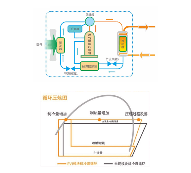 低温热泵使用喷气增焓压缩机,采用两级节流中间喷气技术。当室外温度很低时,蒸发器热交换能力下降,压缩机正常吸气口的主吸气流量减少,通过中间压力补气喷射口补充制冷剂气体,从而增加压缩机排气量,使用侧热交换器制热的循环制冷剂量增加,实现制热量增加。