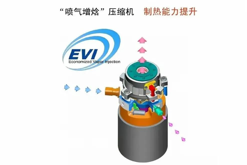 喷气增焓压缩机是采用两级节流中间喷气技术,采用闪蒸器进行气液分离,实现增焓效果。主要通过中低压时一边压缩一边喷气混合冷却,然后高压时正常压缩,提高压缩机排气量,达到低温环境下制热能力的目的。其中高效过冷却器在整个系统中也起到了关键性作用,一方面对主循环回路冷媒进行节流前过冷,增大焓差;另一方面对辅助回路中经过电子膨胀阀降压后的低压低温冷媒进行适当的预热,以达到合适的中压,提供给压缩机进行二次压缩。