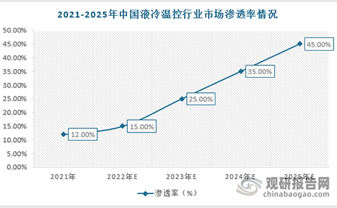 不过,随着充放电倍率的提升、中高功率储能产品的普及,液冷技术研发将不断取得新突破,市场规模及渗透率也将进一步提升。根据数据显示,2021年我国液冷温控行业市场规模约3亿元,预计2025年市场规模将达74.1亿元;渗透率有望由2021年的12%提升至2025年的45%。
